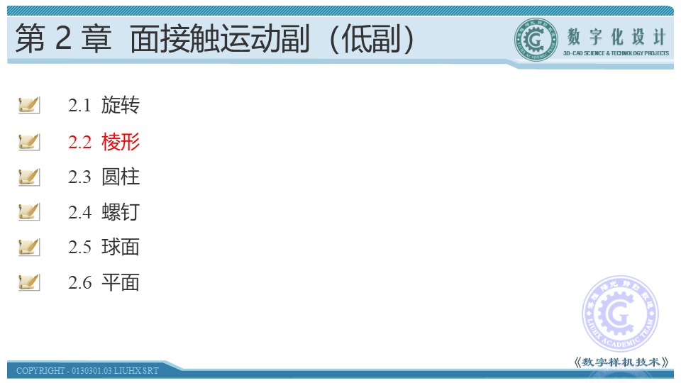 本节介绍棱形的概念、运动副的创建方法以及机构的驱动。棱形副是两个零部件之间的相对运动为沿某一条公共直线滑动的运动副,该类运动副常用于机床刀架的移动及液压缸的伸缩。学习时,应在理解棱形概念的基础上,通过具体操作,掌握其创建方法。