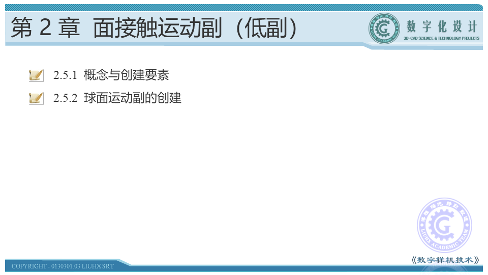 本节介绍球面的概念、运动副的创建方法以及机构的驱动。球面副是指两零部件之间仅被一公共点或一公共球面约束的多自由度运动副,可以实现多方向的摆动与转动,又称球铰。球面副构成的运动机构常见于球形万向节,以及各类具有仿形功能的杆件系统中,如拖拉机的后悬挂装置。学习时,应在理解球面概念的基础上,通过具体操作,掌握其创建方法。