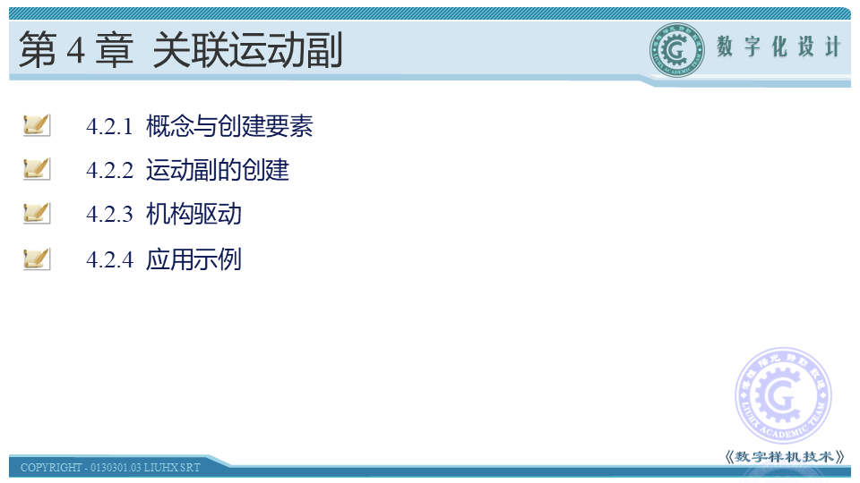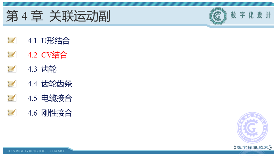 本节介绍CV接合的概念、运动副的创建方法以及机构的驱动。CV接合用于通过中间轴同步关联两个特定位置的旋转运动副,关联的基本条件是三条轴线相交并处于同一平面内,且输入、输出端轴线与中间轴轴线夹角相同。学习时,应在理解CV接合概念的基础上,通过具体操作,掌握其创建方法。