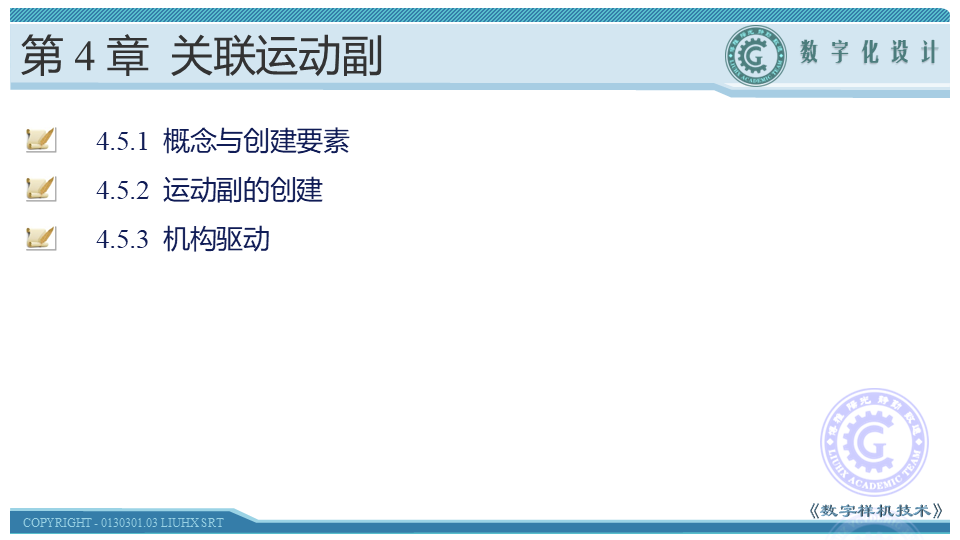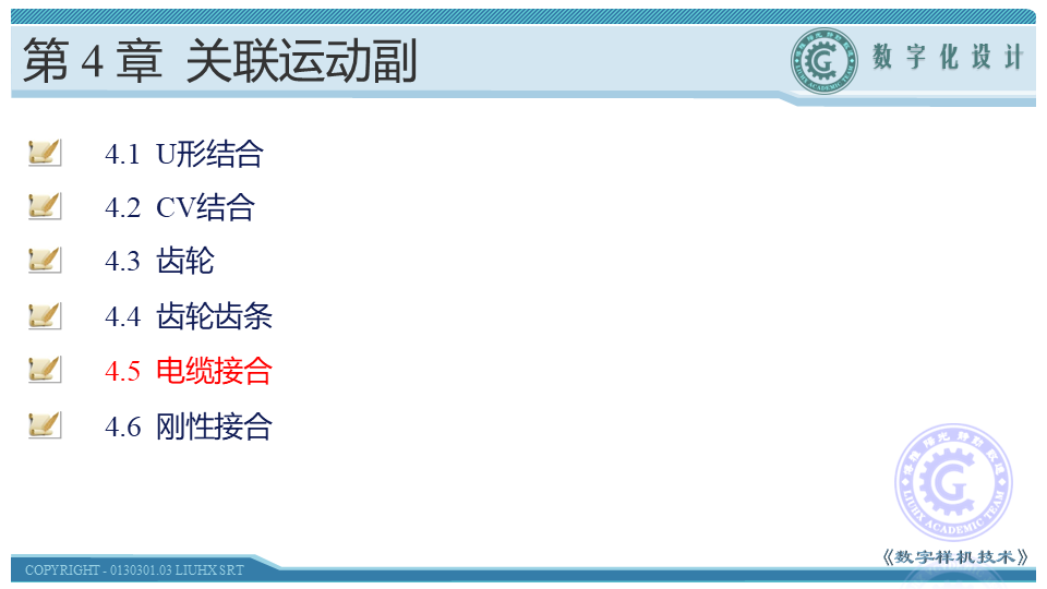 本节介绍电缆接合的概念、运动副的创建方法以及机构的驱动。电缆接合用于以一定比率关联两个棱形运动副,在运动机构中实现具有一定配合关系的两个直线运动。学习时,应在理解电缆接合概念的基础上,通过具体操作,掌握其创建方法。