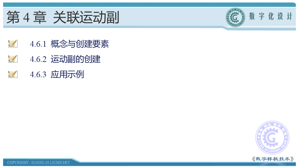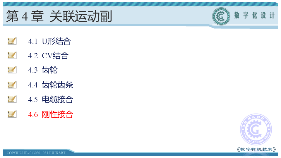 本节介绍刚性接合的概念以及运动副的创建方法。刚性接合用于将两个零部件在初始位置不变的情况下,实现空间上的一种限制所有自由度的完全约束,使关联体在运动机构建立过程中具有一个零部件的整体属性。学习时,应在理解刚性接合概念的基础上,通过具体操作,掌握其创建方法。