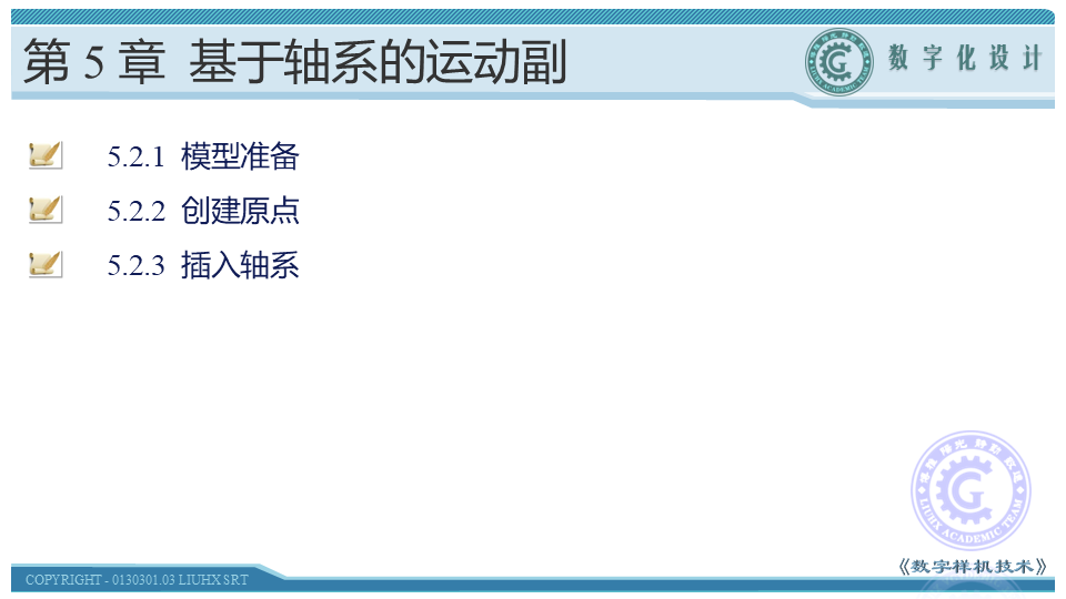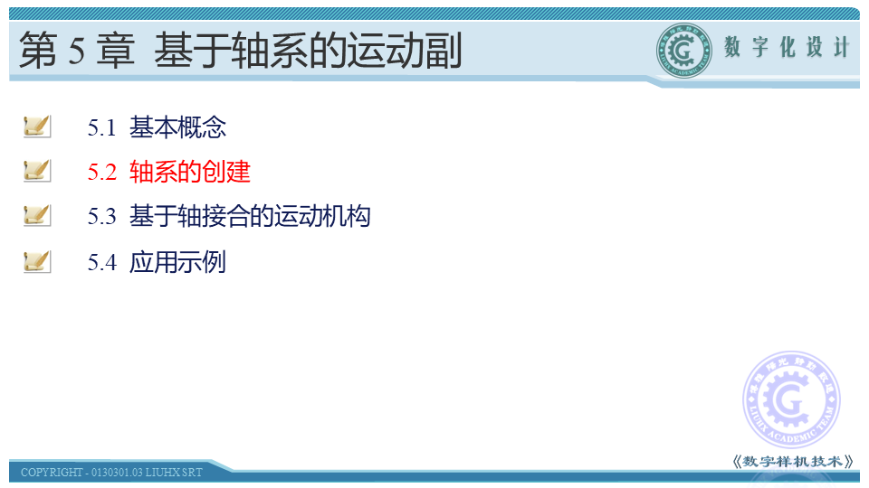 本节介绍基于轴系的运动副中轴系的创建方法。创建轴系是创建基于轴系的运动副的基础,只有创建正确的轴系,机构才能按照所要求的运动方式运动,需要建立的轴系的要求取决于待建运动副的形式。