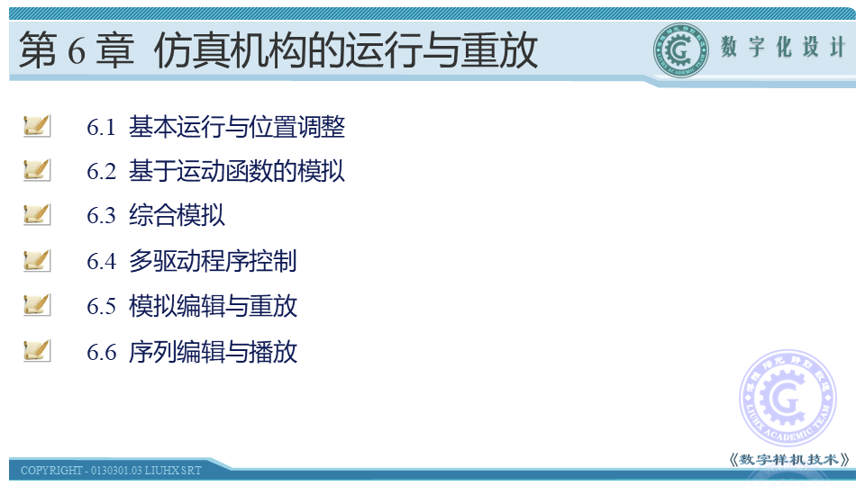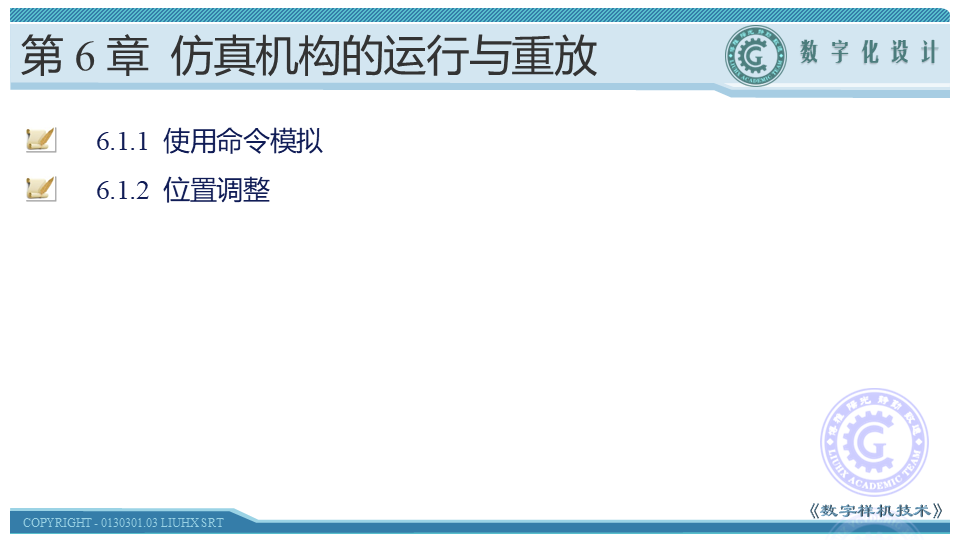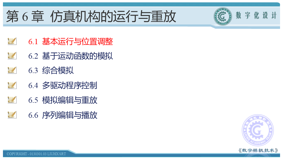 本节介绍仿真机构的基本运行与位置调整。仿真机构的运行是运动机构创建完成之后的必要步骤,而机构的位置调整可以方便地对机构进行接下来的观察与操作。本节是运动仿真技术的基础,同学们应充分掌握其操作方法。