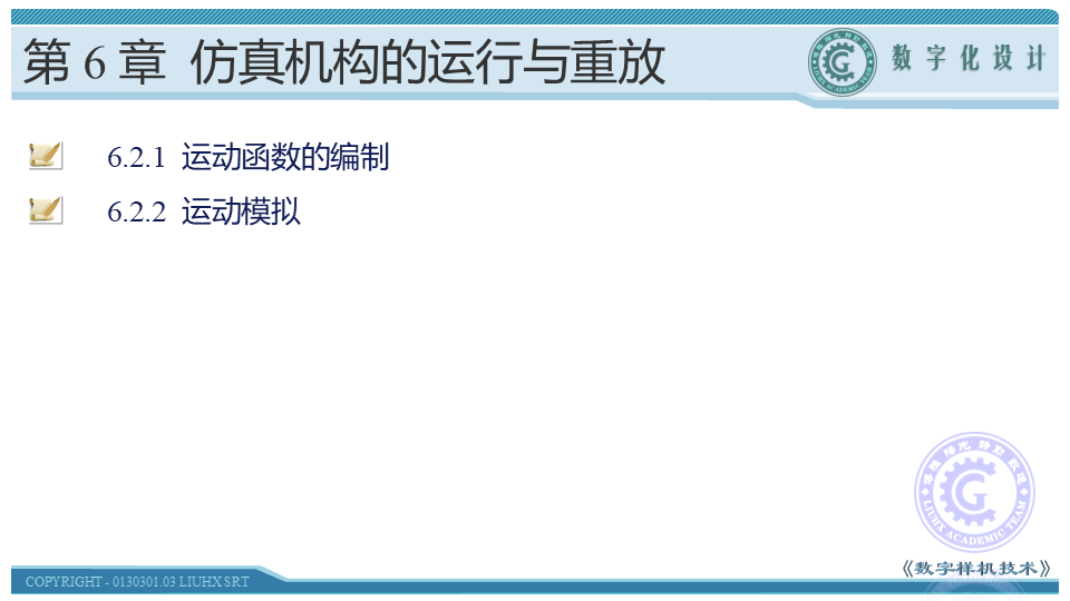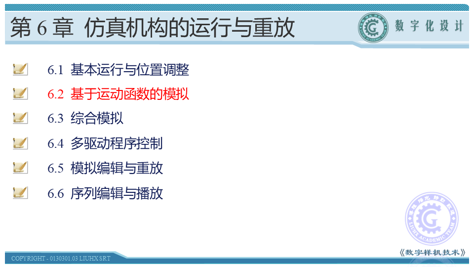 本节介绍仿真机构的基于运动函数的模拟。基于运动函数的模拟可以使运动机构按照设定好的运动函数运动,从而可以定量地测量所需要的参数。本节的难点是运动函数的编制,在学习时,应理解并掌握CATIA中编制运动函数的格式。