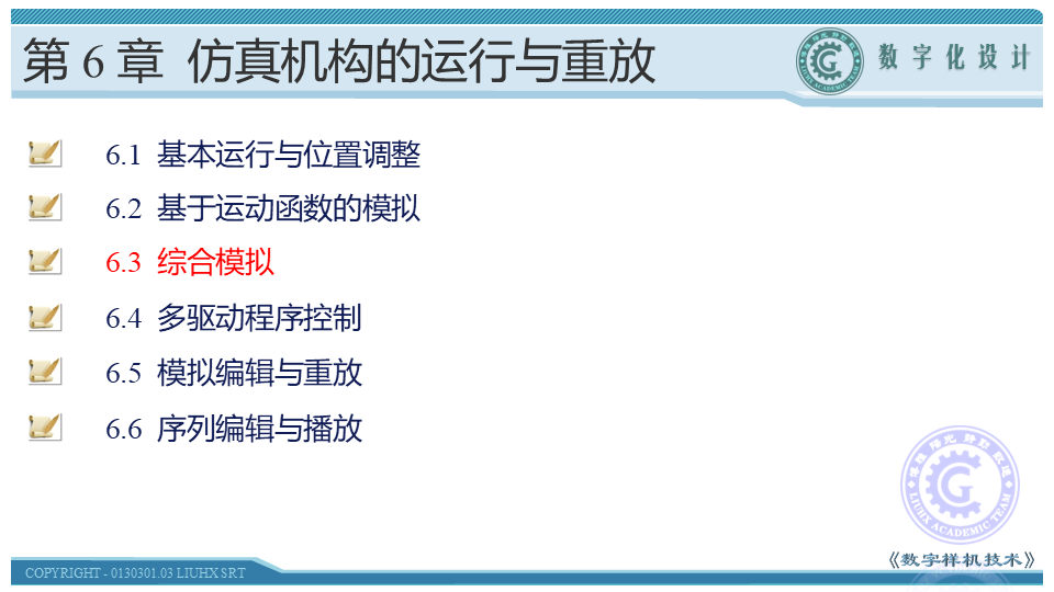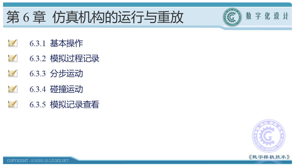 本节介绍仿真机构的综合模拟,这种模拟方式可以记录下机构在运动过程中的某些画面,从而使机构在查看时形成特定的视觉效果。本节内容包括“基本操作”、“模拟过程记录”、“分步运动”、“碰撞运动”和“模拟过程记录”等部分,重点是如何记录机构运动的过程。