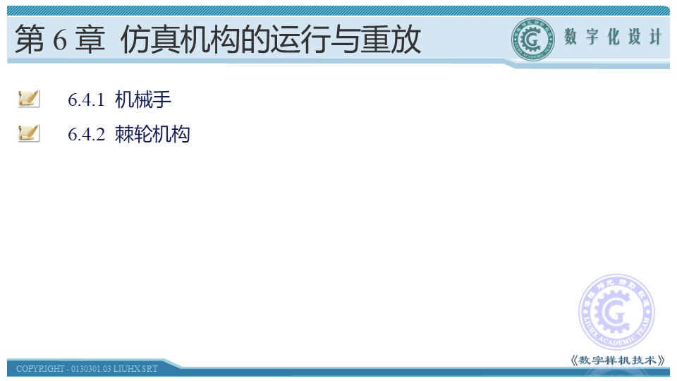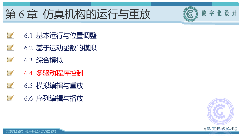 本节讲解另一种控制仿真机构的运行的方法——多驱动程序控制。以机械手和棘轮机构这两个具体的机构为例介绍如何通过程序控制仿真机构的运行。这种方法和基于运动函数的模拟类似,都可以对机构进行定量控制。本节是本章的难点,同学们在学习时应理解代码的含义以及如何计算控制参数,在此基础上编制程序代码。