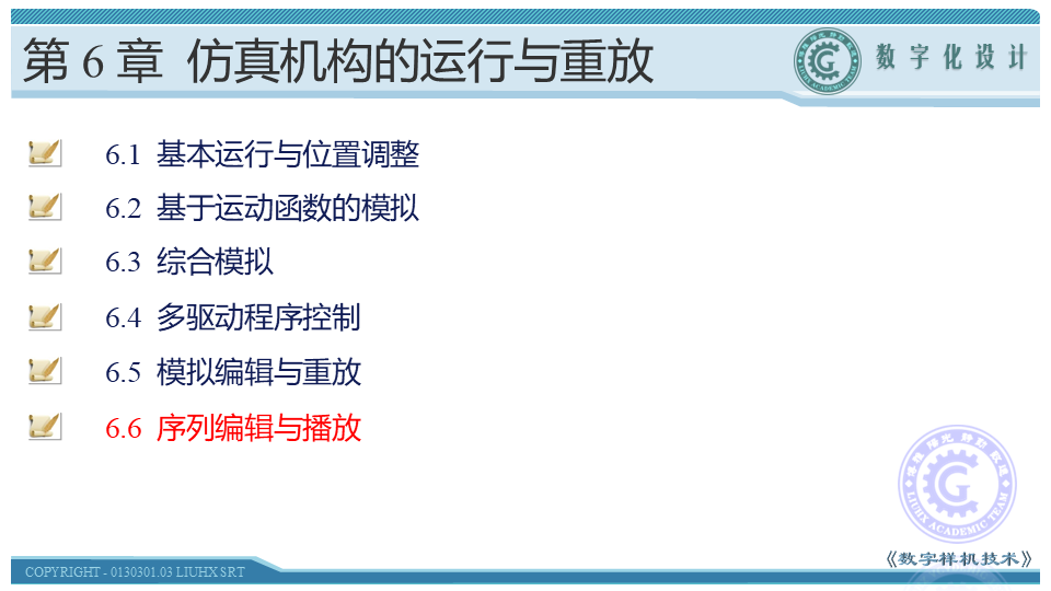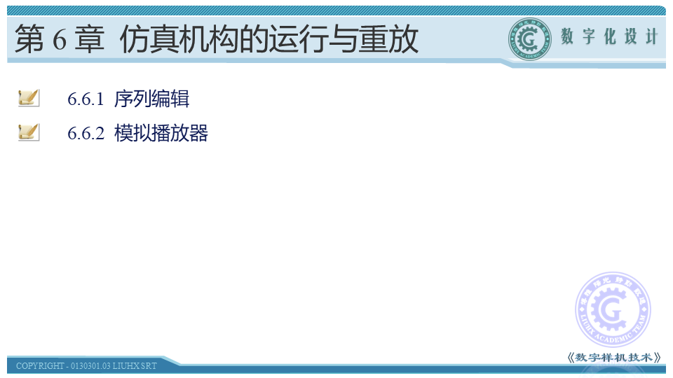 本节介绍序列编辑与播放。对于结构树上具有多个“模拟”的运动机构,使用序列设置可以编排模拟的播放顺序,用于多种运动状态的连续观察与功能展示。而“播放器”面板可以播放“模拟”、“重放”、“序列”等,在“播放器”面板上使用功能键可以播放选中的对象或对“步长”、“延迟”等参数进行调整。