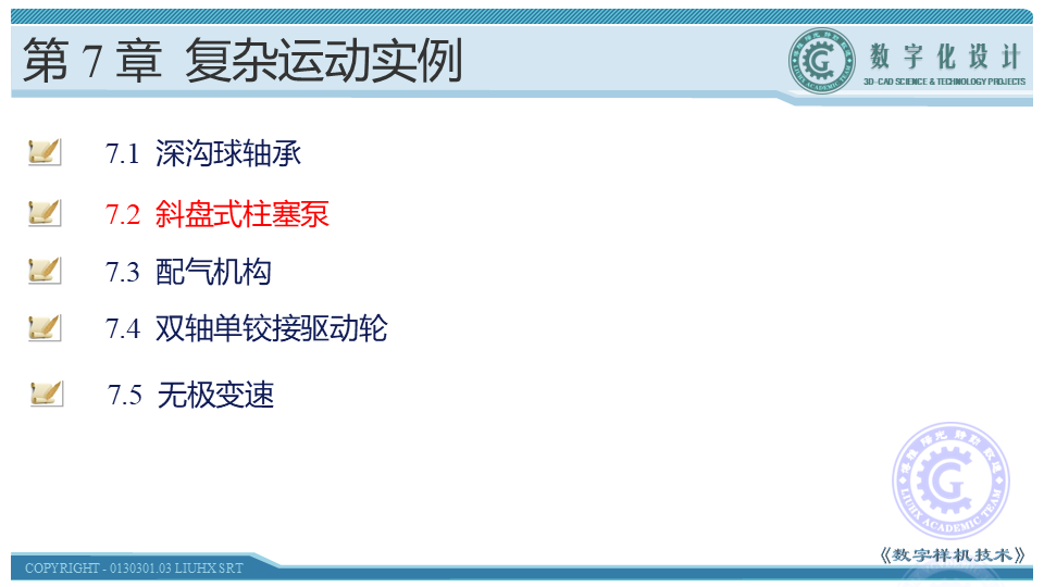 本节主要讲述斜盘式柱塞泵运动仿真的创建,斜盘式柱塞泵的运动包括主运动和调节运动两部分。主运动包括缸体总成相对于壳体总成的转动、由缸体总成的转动带动的柱塞在缸体柱塞孔内的移动、柱塞与滑靴的铰接,以及滑靴在斜盘表面上的平面运动。调节运动有调节拉杆相对壳体总成的螺旋运动、调节拉杆相对斜盘总成的滑动和斜盘总成相对壳体总成的转动。通过静态装配、运动副转换、模型驱动完成运动仿真的创建。深化学者对仿真创建的掌握程度。
