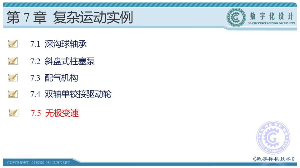本节主要讲述无级变速系统运动仿真的创建,无级变速系统可以连续获得变速范围内任何传动比。本例中滚轮式无级变速系统使用转盘和滚轮的结合传递扭矩并改变传动比。输入转盘旋转带动滚轮的旋转,滚轮带动输出滚轮的旋转,通过连续改变滚轮的倾斜角度,得到平顺而连续的传动比。并通过系统的运动函数进行编辑,实现其运动规则,让学者更加深刻理解运动仿真的不同设计思想。