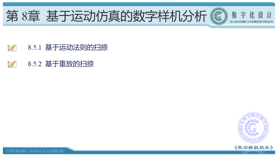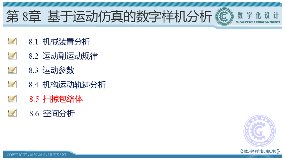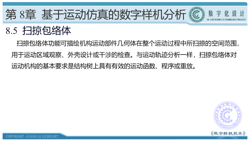 本节主要讲述扫掠包络体,扫掠包络体功能可描绘机构运动部件几何体在整个运动过程中所扫掠的空间范围,用于运动区域观察、外壳设计或干涉的检查。与运动轨迹分析一样,扫掠包络体对运动机构的基本要求是结构树上具有有效的运动函数、程序或重放。