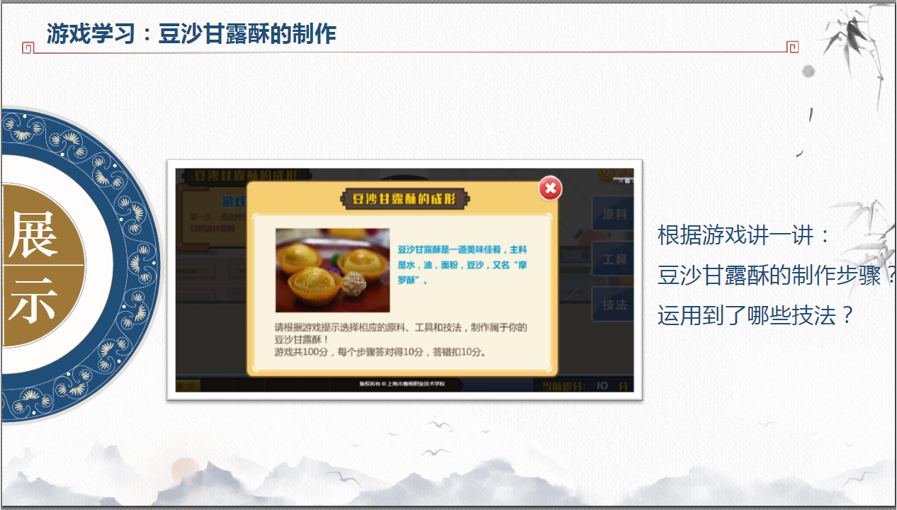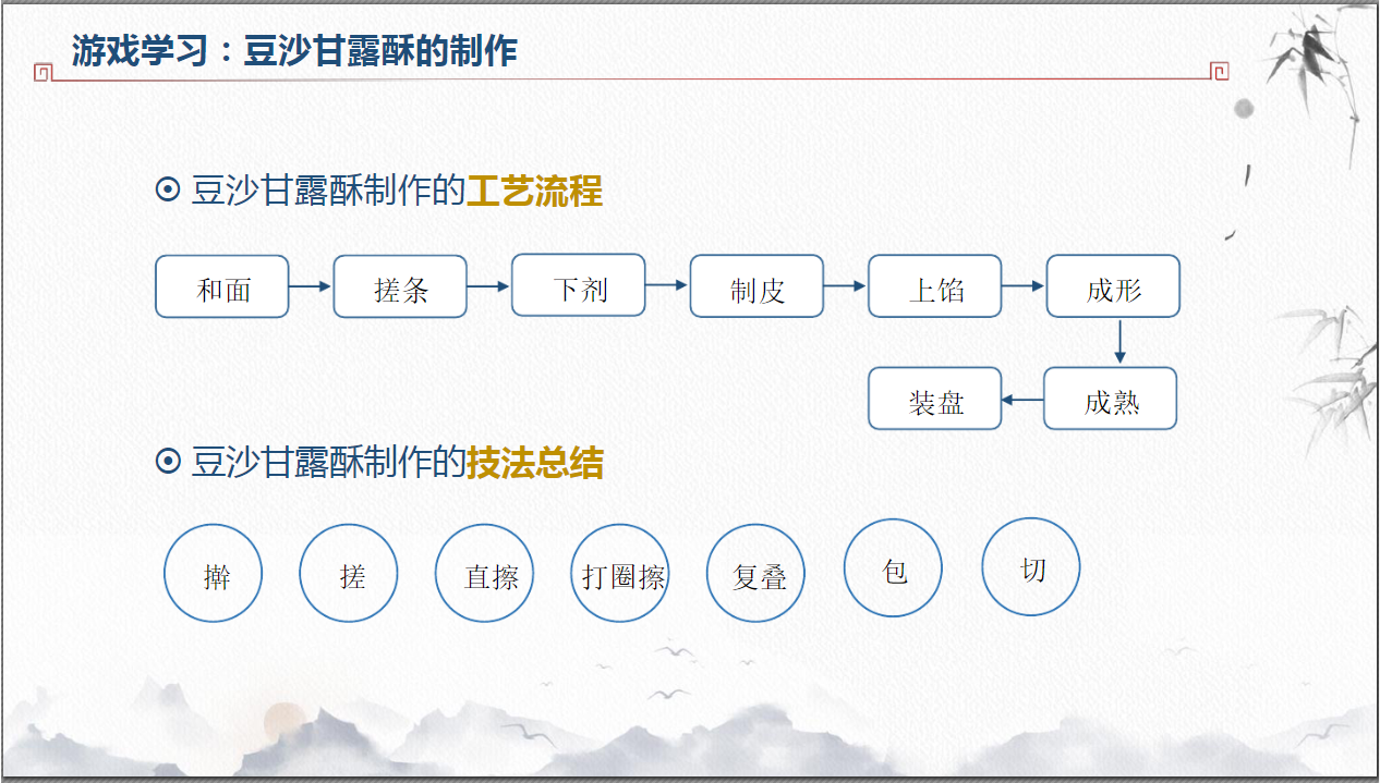请你在手机上尝试做移动交互游戏,然后根据游戏讲一讲:豆沙甘露酥的制作步骤有哪些?运用到了哪些技法?点击进入游戏