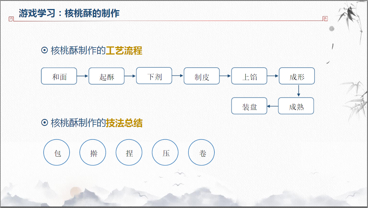 请你进入手机云教材,尝试做移动交互游戏,然后根据游戏讲一讲:核桃酥的制作步骤有哪些?运用到了哪些技法?点击进入游戏