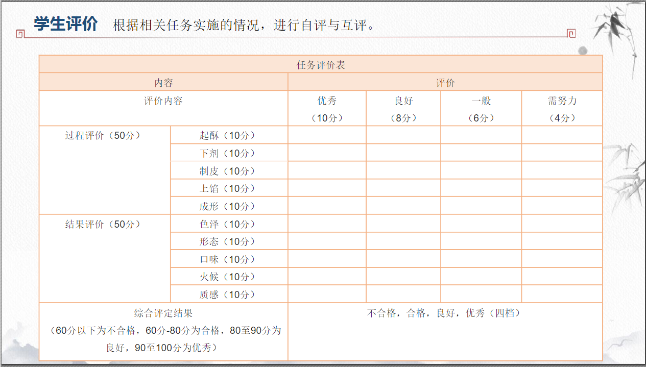 回顾自己作品产生的问题、原因,并思考解决问题的方法,继而提炼总结操作要点,总结形成自己实操经验的认知。注:可在开放课程平台资源中。搜索“核桃酥问题”关键词,查看相关视频,了解解决方法。