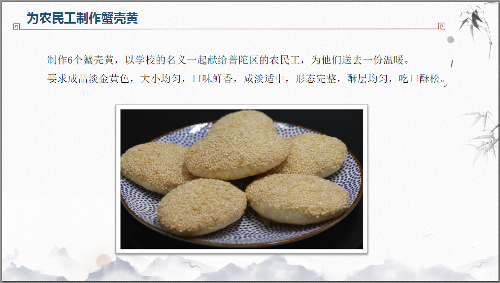 请同学们将为农民工制作的蟹壳黄成品照片上传至平台。