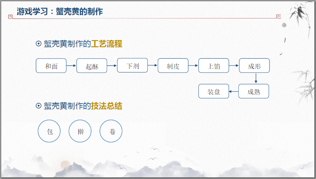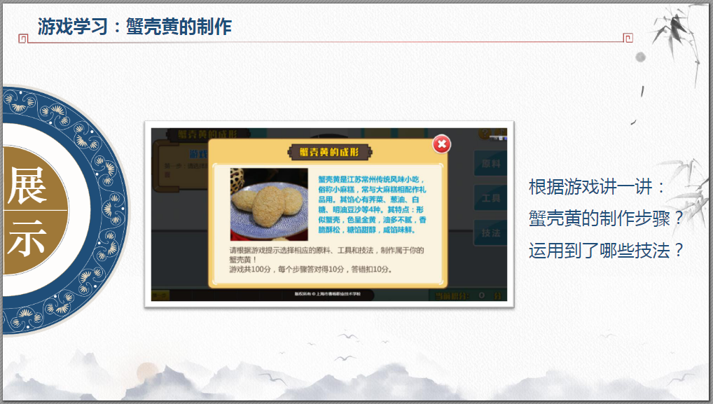 然后根据游戏讲一讲:蟹壳黄的制作步骤有哪些?运用到了哪些技法? 点击文字进入游戏