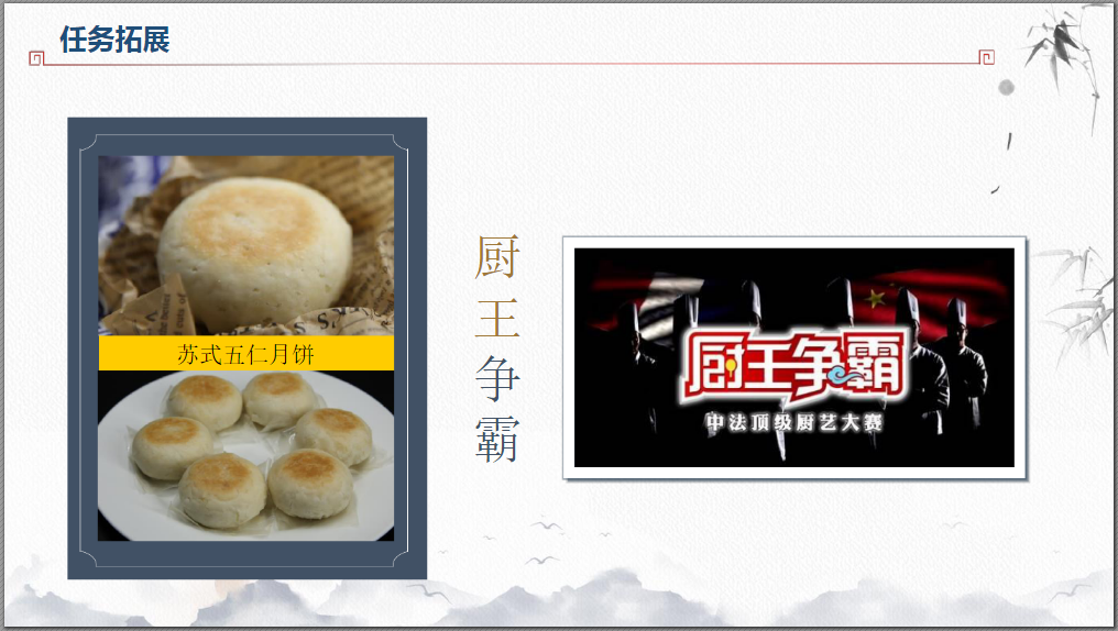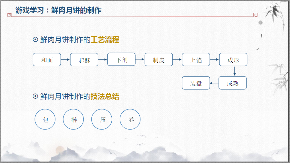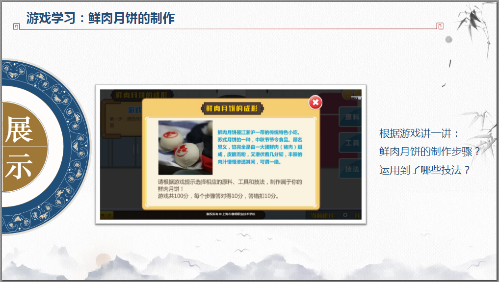 然后根据游戏讲一讲:鲜肉月饼的制作步骤有哪些?运用到了哪些技法? 点击文字进入游戏
