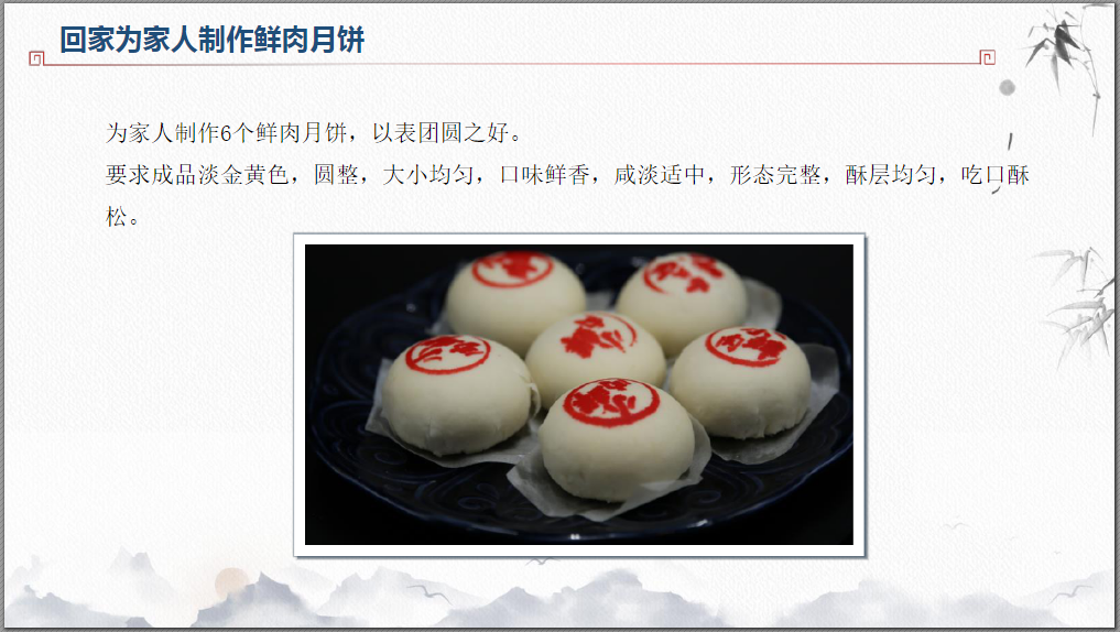 请同学们将为家人制作的鲜肉月饼成品照片上传至平台。