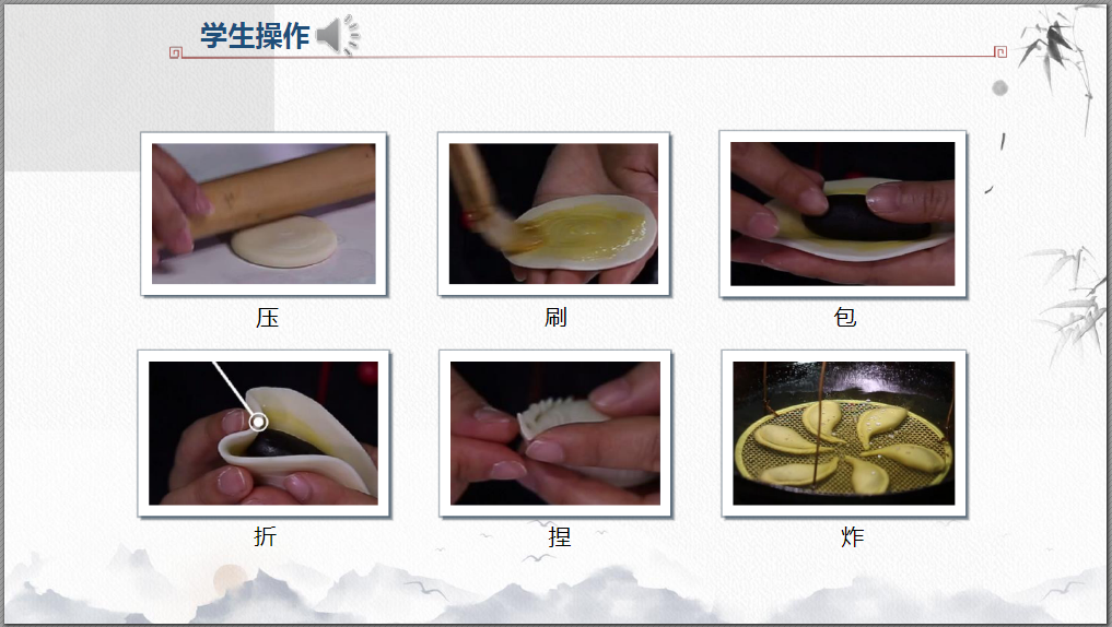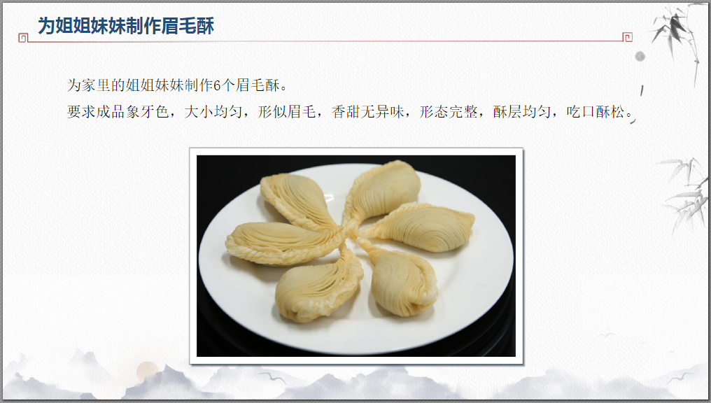 请同学们课前先完成眉毛酥的制作-微课学习,初稿了解眉毛酥的制作方法。