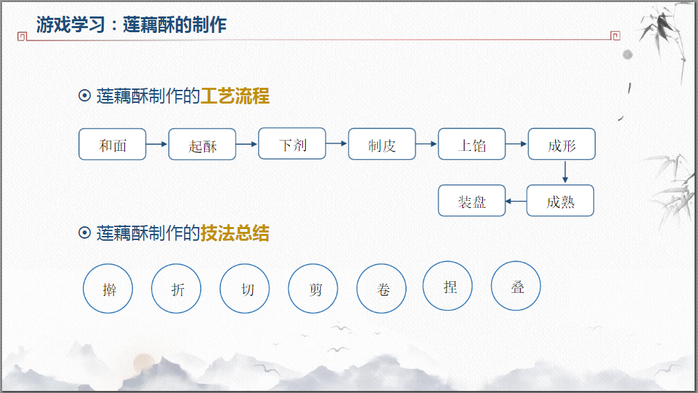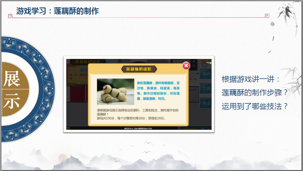 然后根据游戏讲一讲:莲藕酥的制作步骤有哪些?运用到了哪些技法?点击文字进入游戏