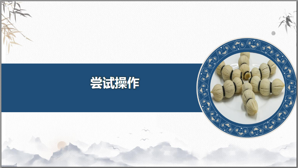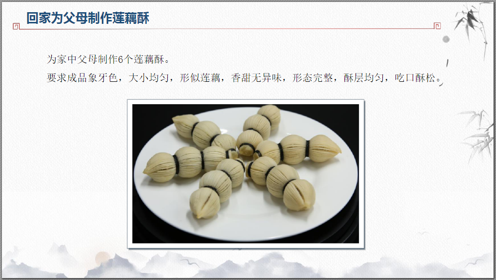 请同学们自行尝试操作——莲藕酥的成形,回顾自己对制作流程及技法掌握多少?并把作品拍照上传。