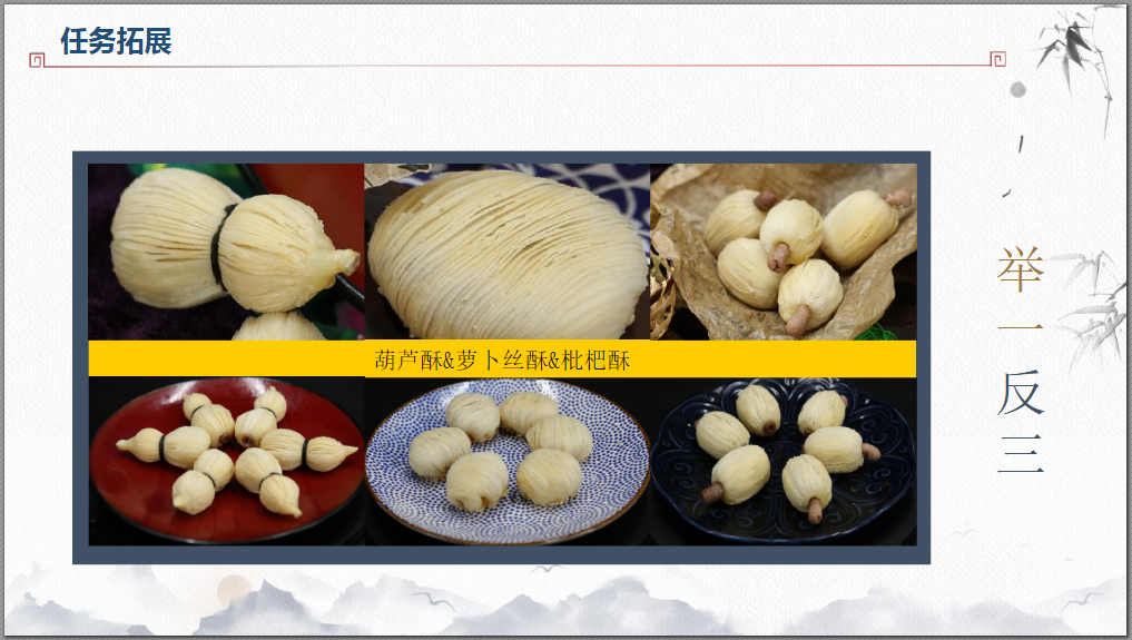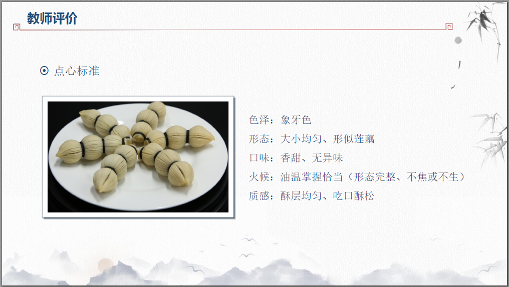 赏微课,学制作:莲藕酥的制作。能准确掌握莲藕酥成形的技法、要领及质量标准。