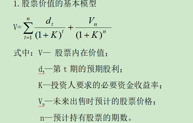 股票的价值又称股票的内在价值,是进行股票投资所获得的现金流入的现值。股票带给投资者的现金流入包括两部分:股利收入和股票出售时的资本利得。因此股票的内在价值由一系列的股利和将来出售股票时售价的现值所构成,通常当股票的市场价格低于股票内在价值才适宜投资。