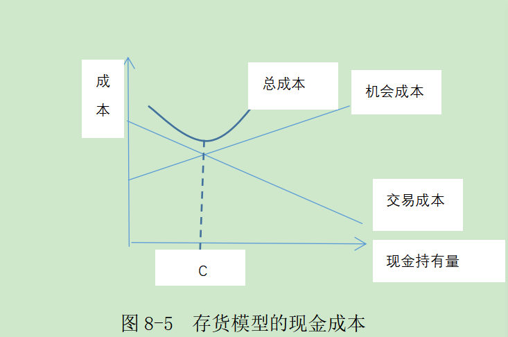 在图8-5中,现金的交易成本和机会成本是两条随着现金持有量呈不同方向变化的曲线,两条曲线的交叉点的现金持有量,即为最佳现金持有量。于是,为了确定最佳的现金持有量C,以使现金的相关总成本最低,假设: