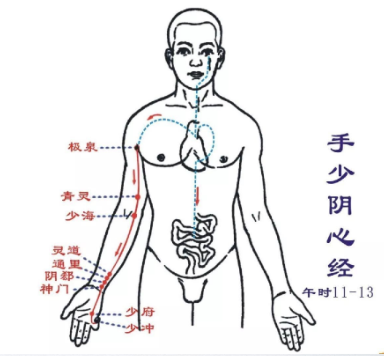 1.经络不通,气滞血瘀-----畅通心经,活血化瘀