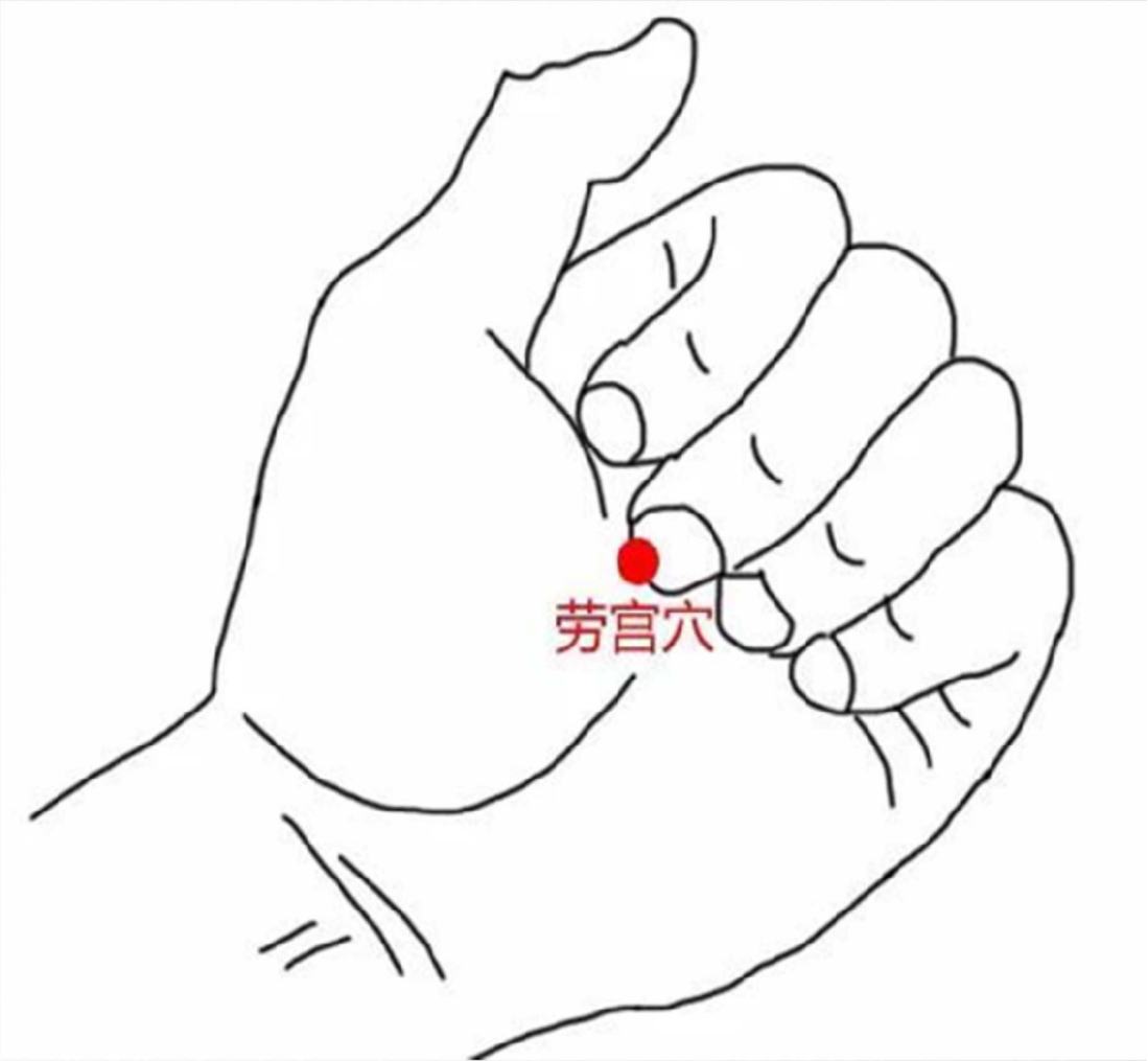 【位置】在手掌心,当第2、3掌骨之间偏于第3掌骨,握拳屈指时中 指尖处。