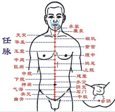 属于奇经八脉,有”阴脉之 海“之称。任脉起于胞中, 止于下颌,共有关元、气海 等24个穴位。位于人体前正 中线上。