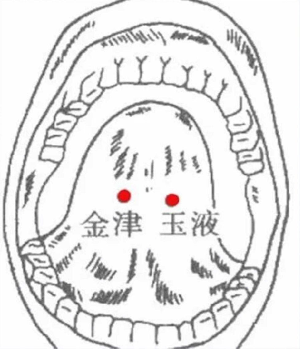 【位置】位于人体的口腔内,舌下系 带的静脉上,左侧为金津穴,右侧为 玉液。