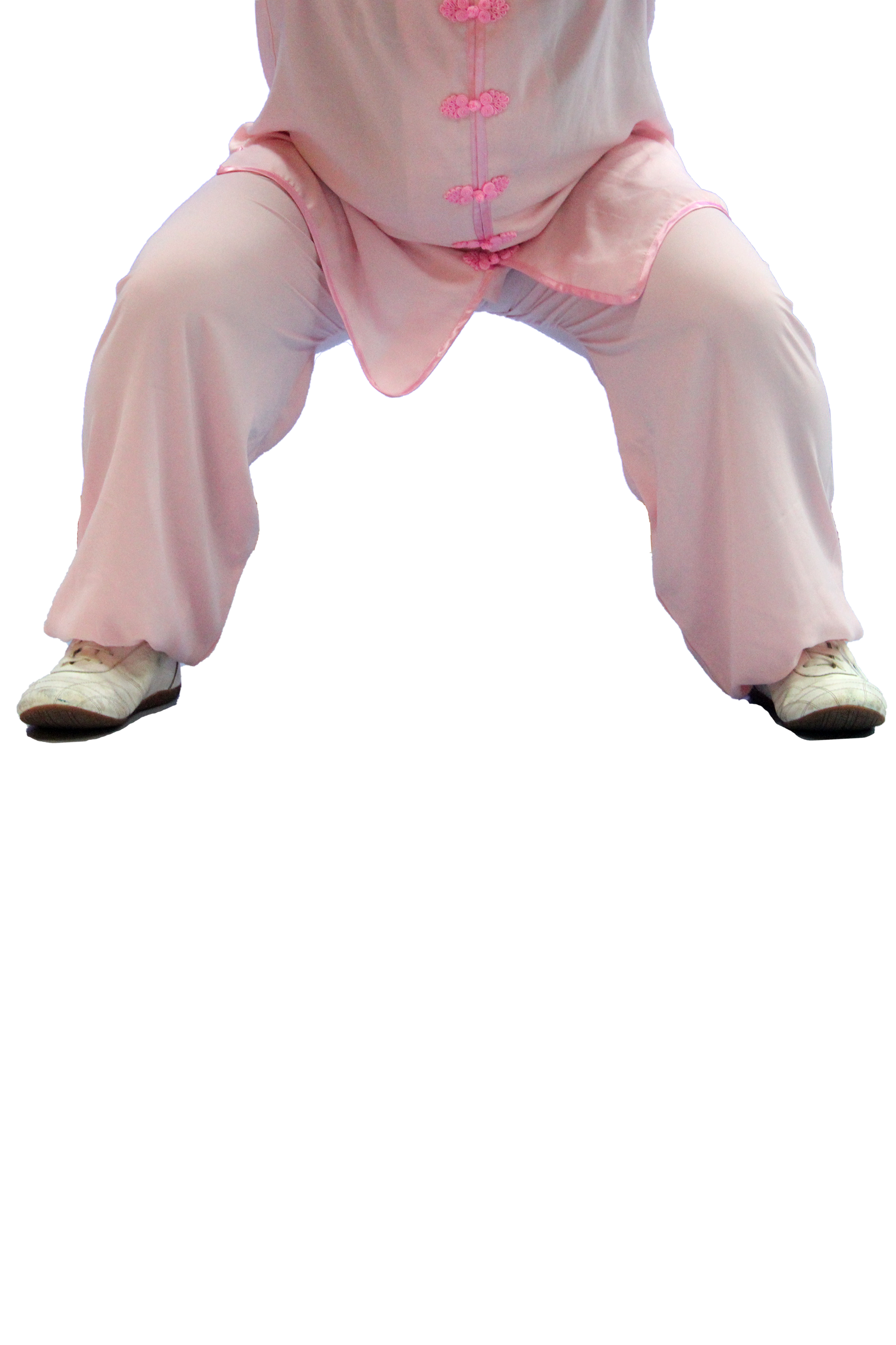 两脚左右分开,间距10~20厘米。两腿屈膝下蹲,前腿脚跟提起,脚尖着地,虚点地面,置于后脚足弓处;后腿全脚掌着地踏实(图7 )。