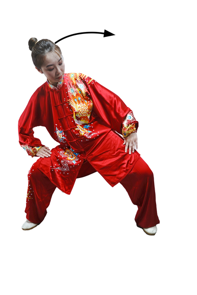 When swinging the upper body,the neck and the buttocks should be stretched away from each other slowly and gently,and in a round and flowing manner.