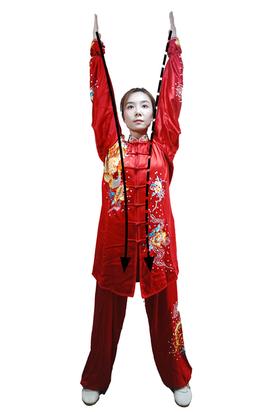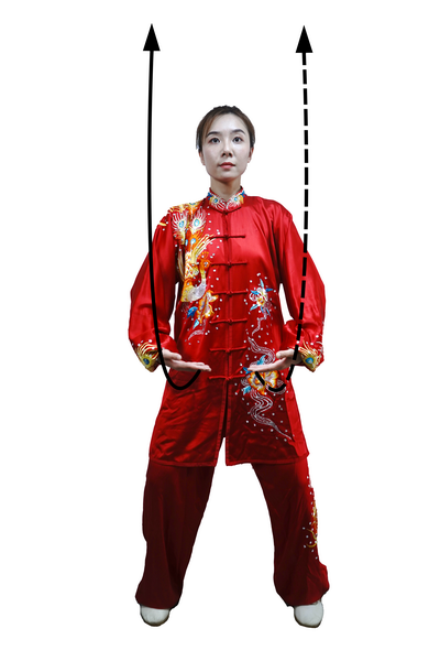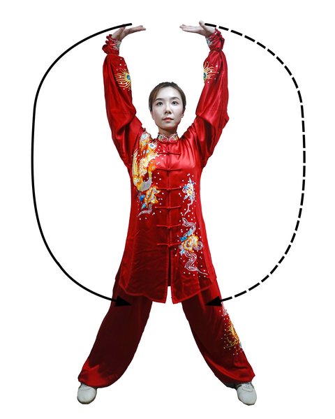 Movement 1:(Continue from the previous routine)Move the body weight leftward.Move the right foot to the right,and stand straight,with the feet apart.Raise the hands,and turn the arms inward when they are chest—high.Continue lifting the hands to above the head,with the elbows slightly bent,palms up,and the fingers pointing to each other.Look straight ahead[Fig.35].