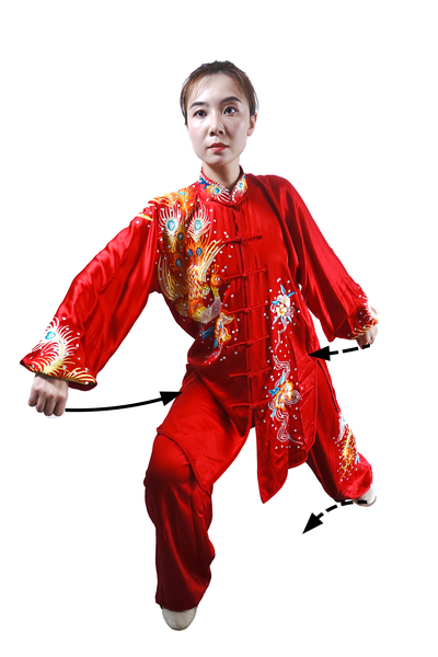 动作二:身体重心前移;左脚向左前方落地,全脚掌踏实,脚尖朝前,右腿伸直;身体右转,左臂内旋前靠,左拳摆至左膝前上方,拳心朝左;右掌摆至体后,拳心朝后;目视左前方。(图66)