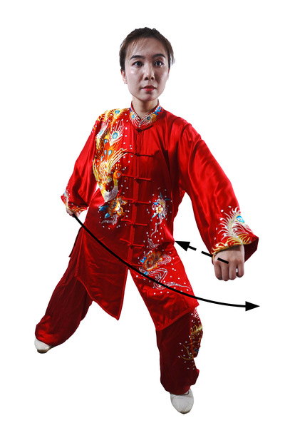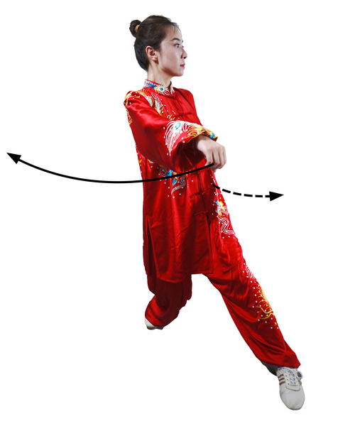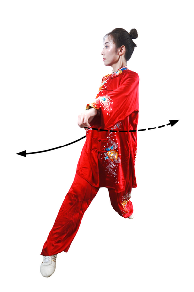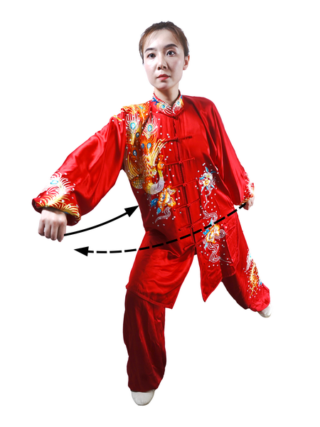 动作三:身体左转,重心后坐;右腿屈膝,左腿伸直;拧腰晃肩,带动两臂前后弧形摆动;右拳摆至左膝前上方,拳心朝右;左拳摆至体后,拳心朝后;目视左前方。(图67)