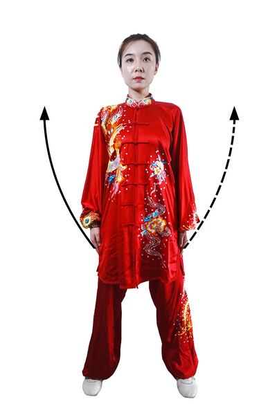 重复一至八动一遍后,左脚上步,开步站立;同时,两手自然垂于体侧(图73)两掌向身体侧前方举起,与胸同高,掌心向上;目视前方(图74 )。屈肘,两掌内合下按,自然垂于体侧;目视前方(图75 )。