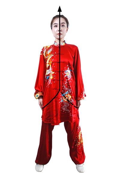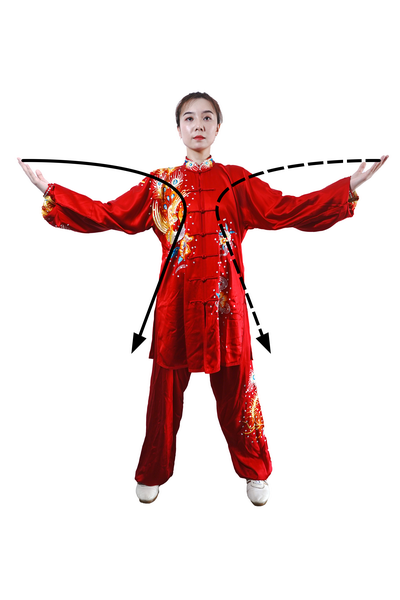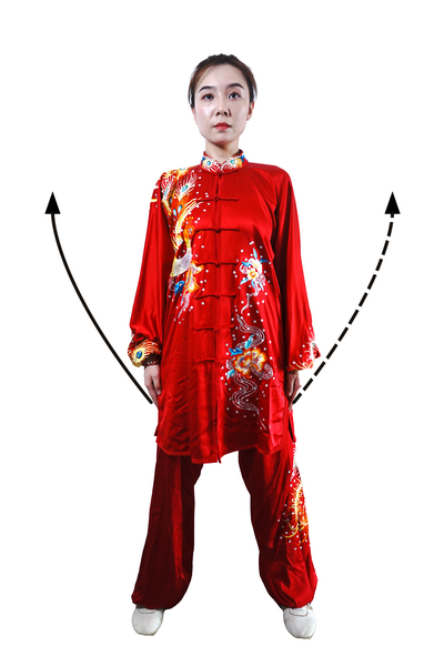 重复一至八动一遍后,左腿向左横开一步,两腿直立;同时,两手自然垂于体侧(图98)两掌向身体侧前方举起,与胸同高,掌心向上;目视前方。(图99)屈肘两掌内合下按,自然垂于体侧;目视前方。(图100)