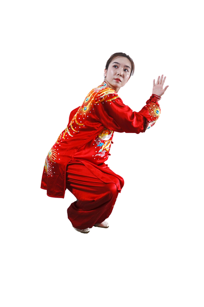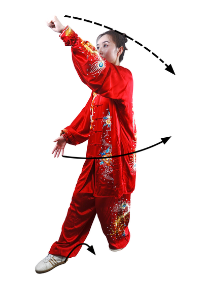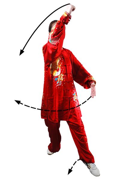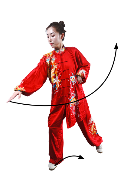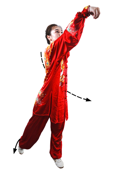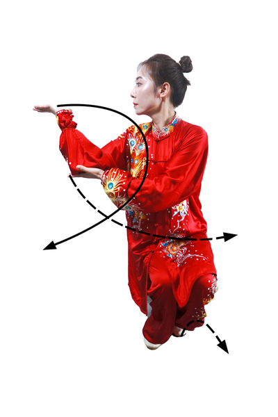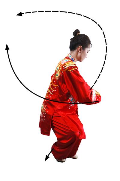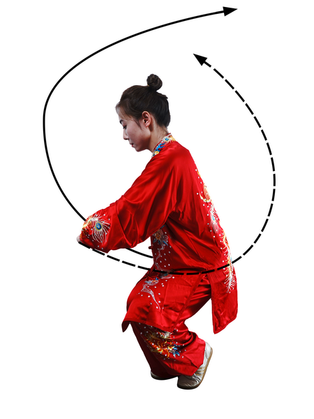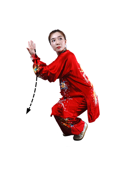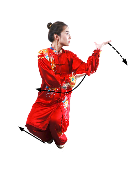 屈膝下蹲时,全身呈收缩状。蹬腿迈步,向上采摘,肢体要充分展开。采摘时变“猿钩”,手指撮拢快而敏捷;变握固后,成托桃状时,掌指要及时分开。