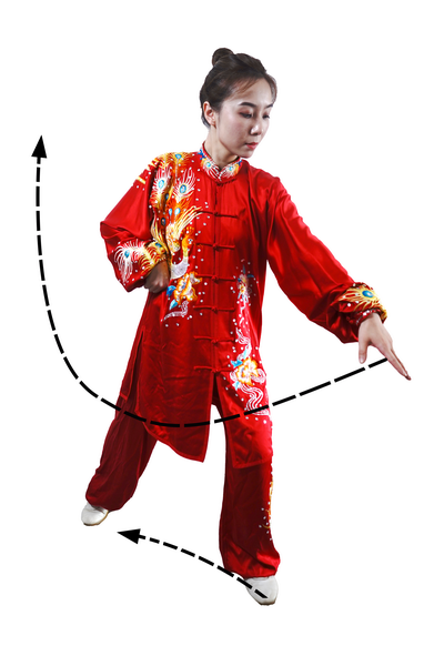 向上采摘,手的运行路线呈向上弧形,动作到位时,手掌才变猿钩状。