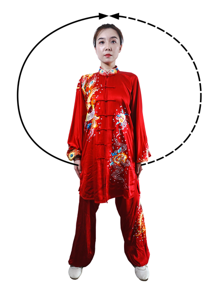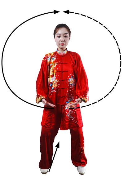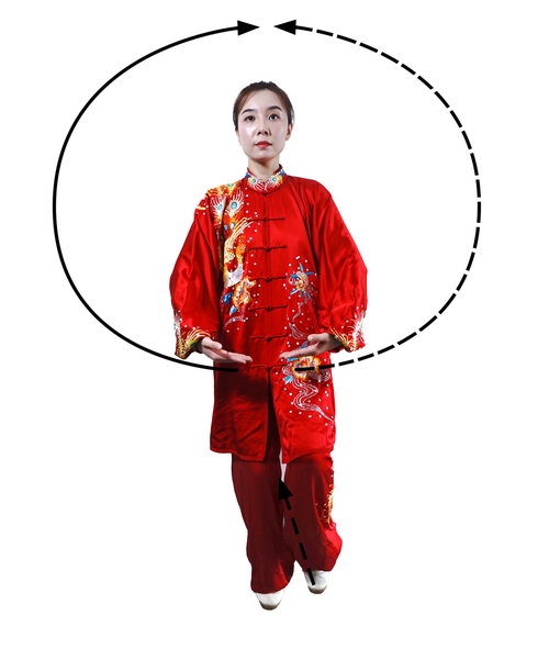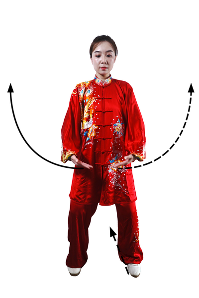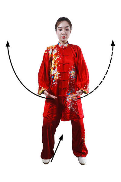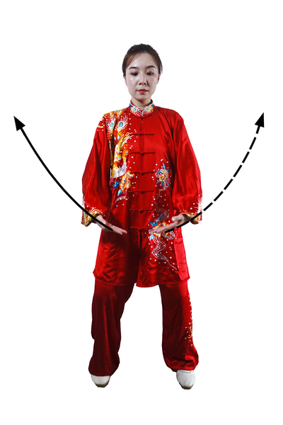 两臂上举时,力从肩发,先沉肩,再松肘,最后提腕,形成手臂举起的蠕动过程;下落时,先松肩,再沉肘,最后按掌合于腹前。