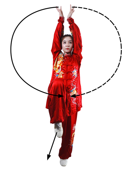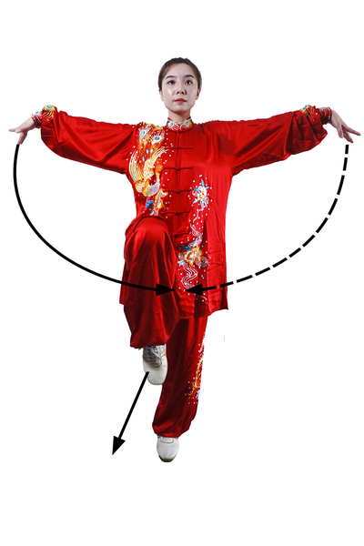 动作一:右腿伸直独立,左腿屈膝提起,小腿自然下垂,脚尖朝下;同时,两掌成展翅状,在体侧平举向上,稍高于肩,掌心向下;目视前方(图111)。