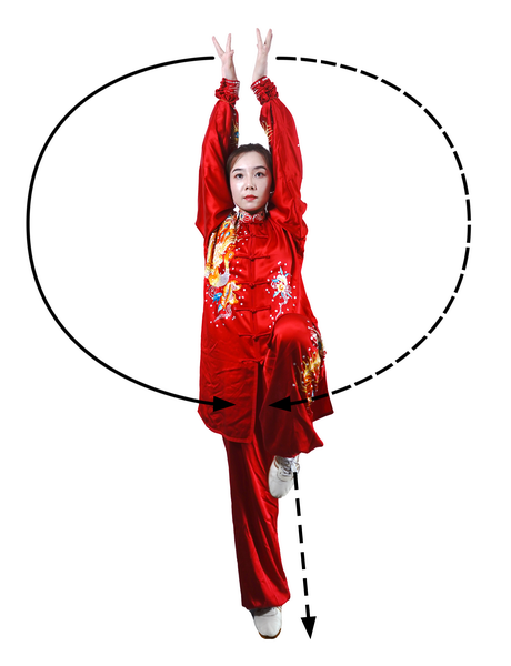动作三:右腿伸直独立,左腿屈膝提起,小腿自然下垂,脚尖朝下;同时,两掌经体侧,向上举至头顶上方,掌背相对,指尖向上;目视前方(图113)。