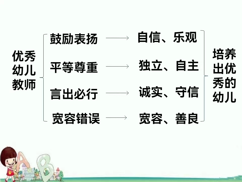 孔子说过:“其身正,不令而行,其身不正,虽令不从”,说明幼儿教师在情感态度知识技能方面成为幼儿的表率.帮助幼儿塑造良好个性品质。幼儿最重要的特点是模仿性,教师的言谈举止,行为礼仪都在潜移默化中影响着幼儿,幼儿教师榜样示范,会帮助幼儿塑造哪些良好的个性品质?学生探究教师对待幼儿态度得出结论: 优秀的教师培养出优秀的幼儿