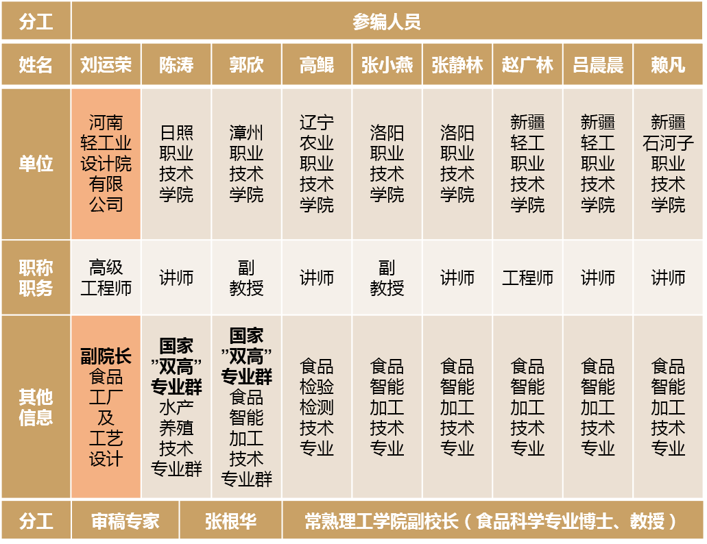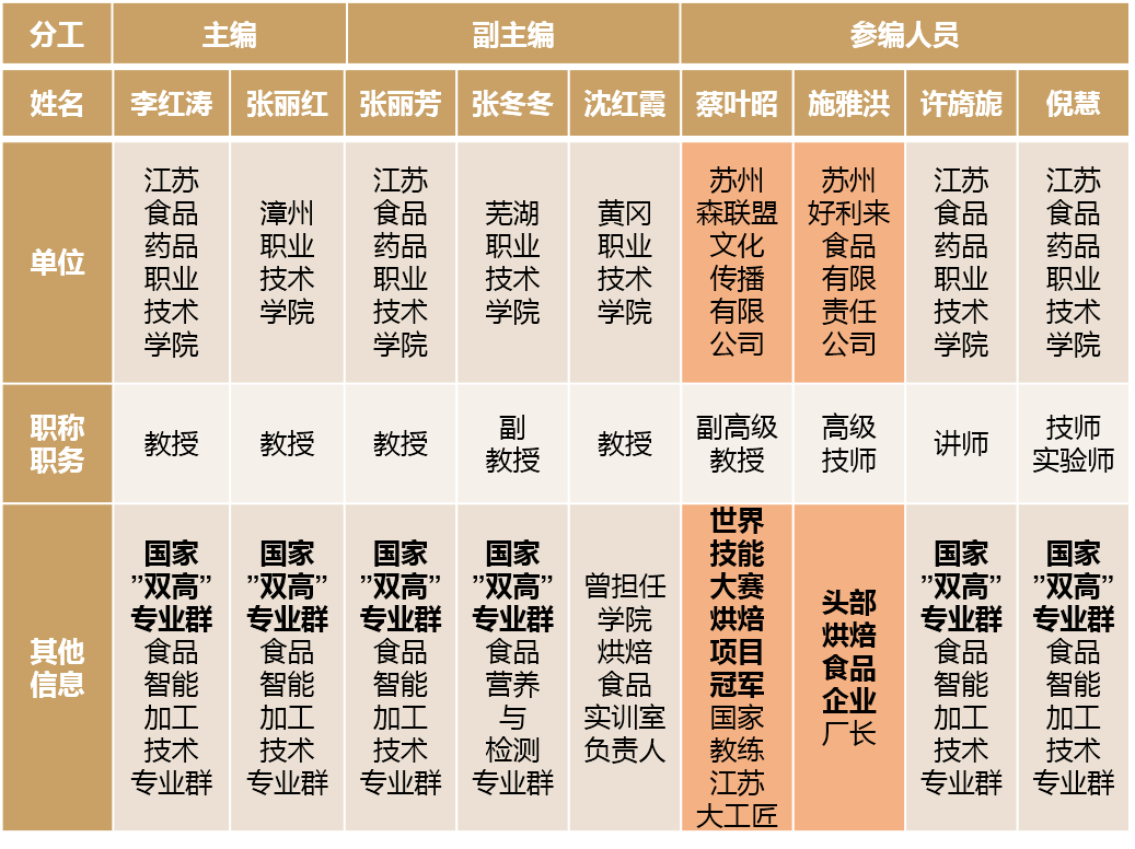 团队共18人,高级职称人员占60%,教学成果丰硕,来自高职院校9位,行业领军培训机构、头部焙烤食品企业、轻工业设计院各1位,垮8省校行企协同;两个院校主编均为国家“双高计划”食品智能加工技术专业群教授,蔡叶昭为第44届世界技能大赛烘焙项目冠军、江苏大工匠、国家级教练,施雅洪为好利来工厂厂长;另外,审稿人张根华教授为本科高校食品科学领域专家。