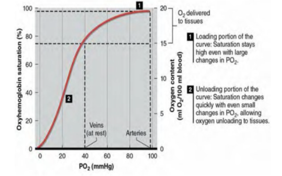 To better respond to increased oxygen demand, hemoglobin unloading of oxygen(desaturation) is enhanced (i.e., the curve shifts to the tight) when PO2decreases, pH decreases, or temperature increases.