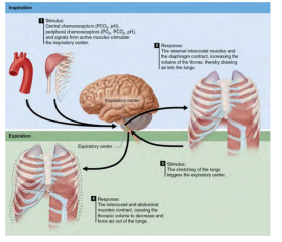 9.Describe how pulmonary ventilation is regulated. What are the chemical stimuli that control the depth and rate of breathing? How do they control respiration during exercise?