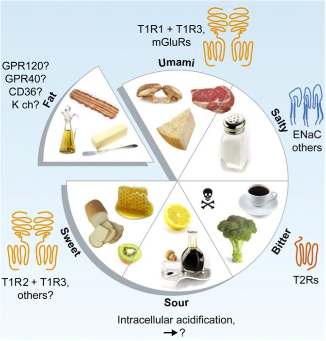 Figure 1: The five basic tastes. Photo credit: Chaudhari, Nirupa, and Stephen D. Roper. (“The Cell Biology of Taste.” The Journal of Cell Biology)