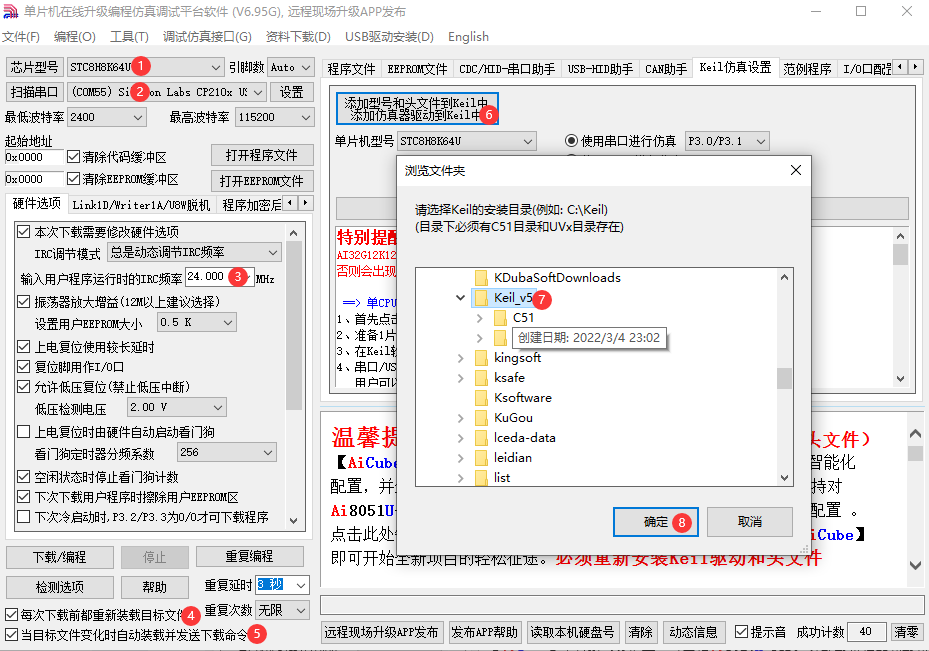 (3)修改程序,统计按键KEY1、KEY2、KEY3、KEY4四个按键按下次数,利用8路LED显示计数值,当计数值超过8次,则P41输出高电平,点亮D14,否则熄灭。