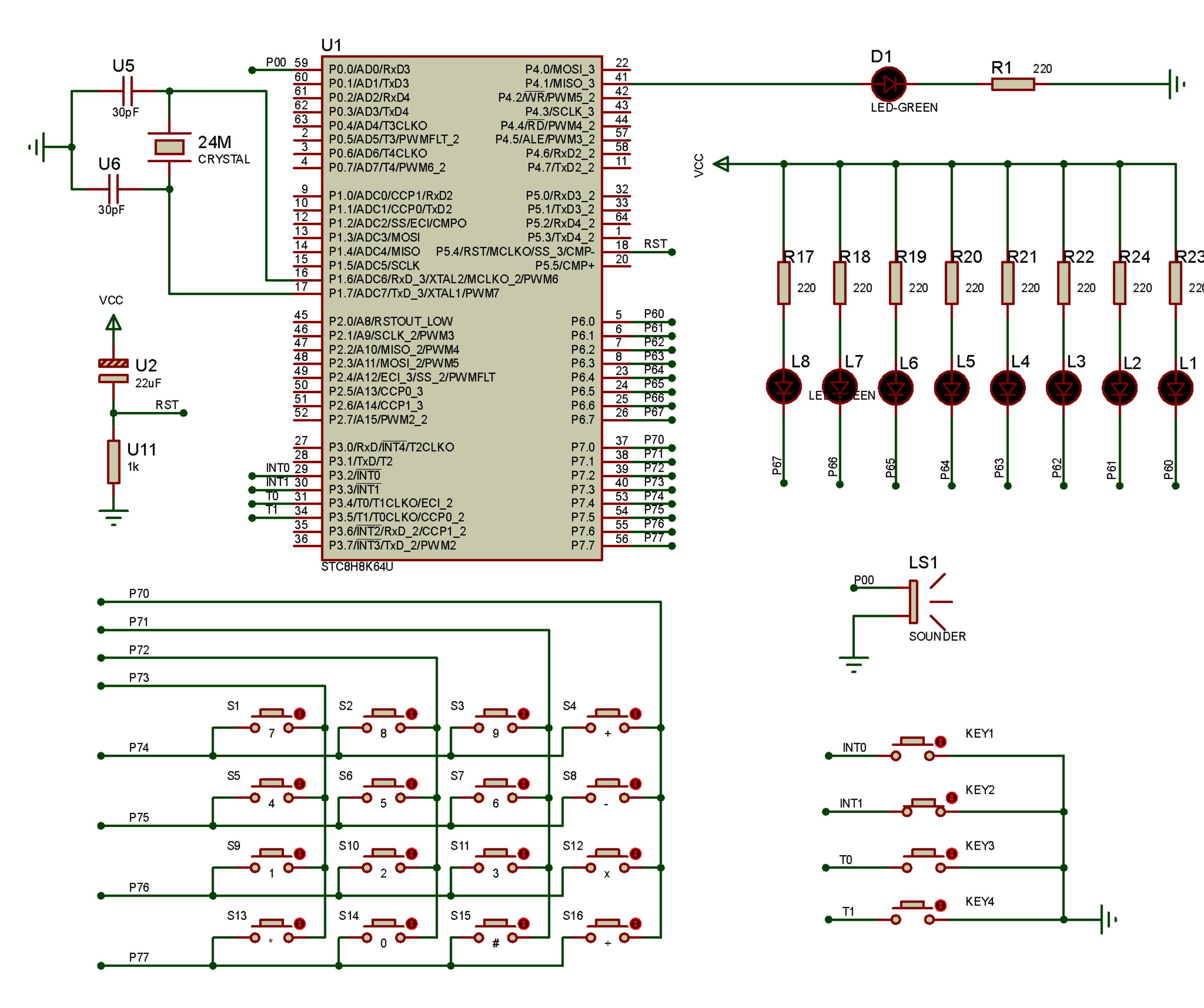 利用矩阵按键和蜂鸣器,构成一个键控蜂鸣电路,上电时蜂鸣器不响,按下按键S1-S16时,蜂鸣器发出不同的音调。